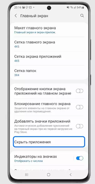 В меню «Главный экран» необходимо найти раздел «Скрыть приложения» и нажать на него.