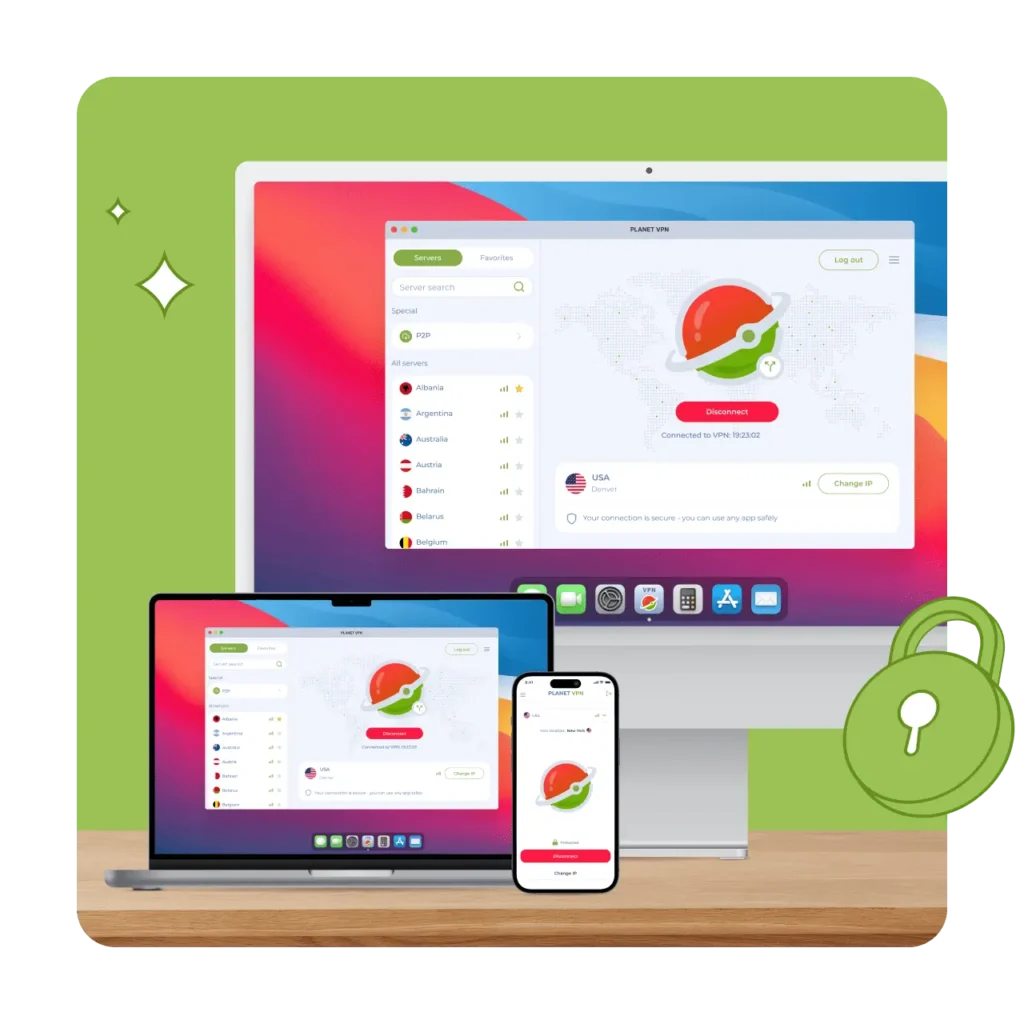 Защитите все свои устройства от онлайн-угроз с помощью Planet VPN — оставайтесь в безопасности, просматривая любимые веб-сайты, просматривая потоковое видео и скачивая торренты.